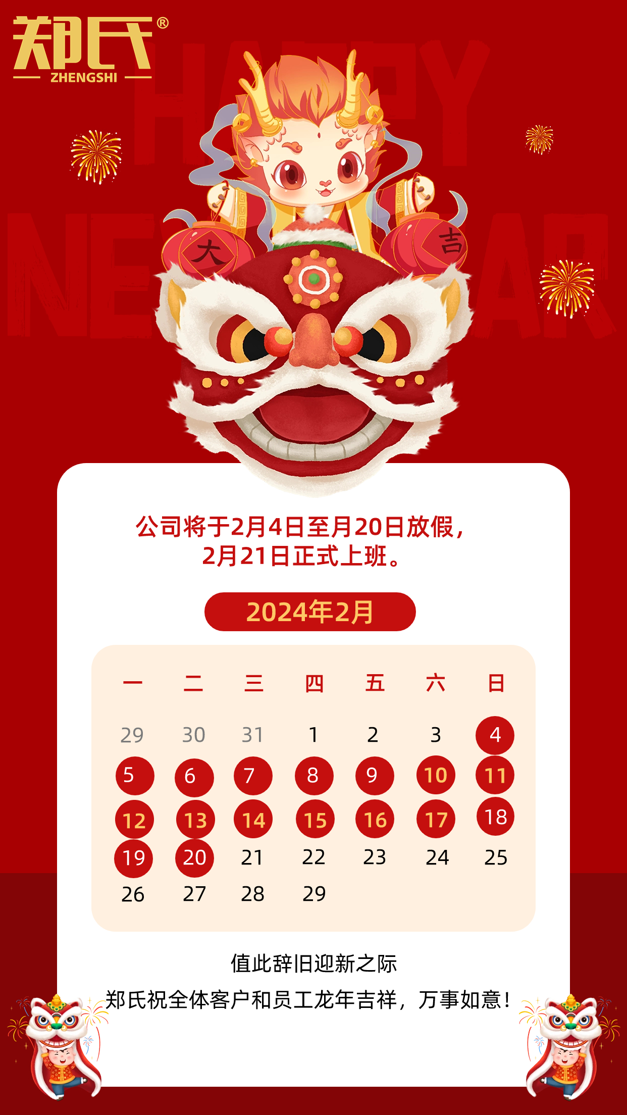 敲響的是鐘聲,走過的是歲月,留下的是故事,帶來的是希望。盼望的是美好,送來的是祝福。新春佳節(jié)來臨之際,鄭氏祝廣大客戶和全體同仁在2024年里事業(yè)有成,身體健康,萬事如意,笑口常開!愿您在新的一年里收獲滿滿,幸福安康,好運(yùn)連連!